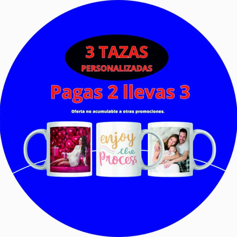 Personaliza 3 unidades tazas (diferentes o iguales) pagando solo 2 unidades